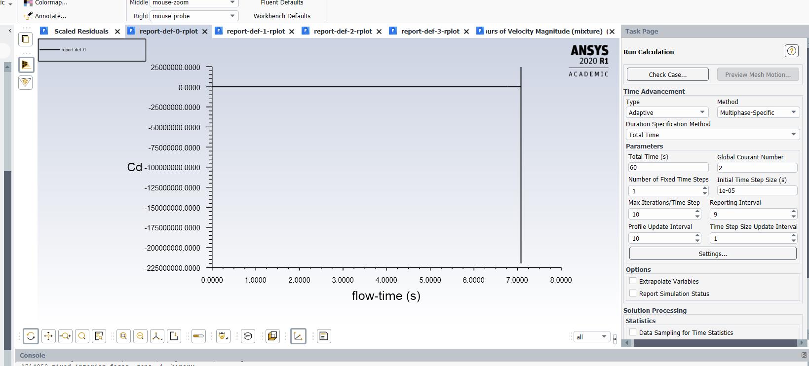 Ansys EmployeeTry to improve mesh quality and increase grid density in the free surface region. Your adaptive time step method is wrong. Use conservative change factors: 0.5 and 1.08. Always store recovery files to get started before point of divergence. Use implicit VOF formulation to be more relaxed regarding CFL. Use max Global CFL as 5. -