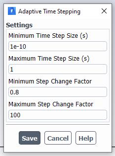 Secondly, in your adaptive time-step settings, why is your max step change factor 100? Could you please revert this number to the default factor of 1.2. Also, you need not go as conservative as 1e-10. I'd strongly suggest that you calculate your minimum time-step size based on CFL = 1 and go one order of magnitude (on the conservative side). That should be sufficient.