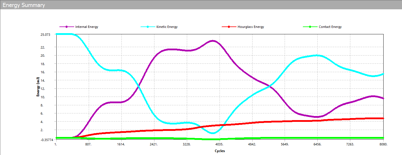Based on the energy summary plot, it looks like the Hourglass energy is quite high. Hourglass energy is a numerical energy and hence should be less as compared to other physical energies (e.g. the Internal energy and Kinetic energy), say less than 5% of the physical energies. So the results you are obtaining are not entirely accurate.