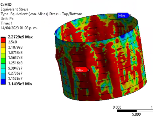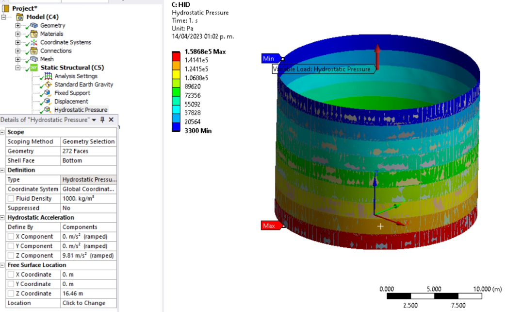 Hi! I am trying to run a static analysis on an oil storage tank, the geometry was 3D scanned, and postprocesed to create a surface, the surface was splitted into 9 different bodies in order to assign different thickness to each shell. I'm using a fixed support in the base of the tank, a displacement support in the top, edge-edge automatic contacts, and hydrostatic presure in all the faces as showed in the following image: