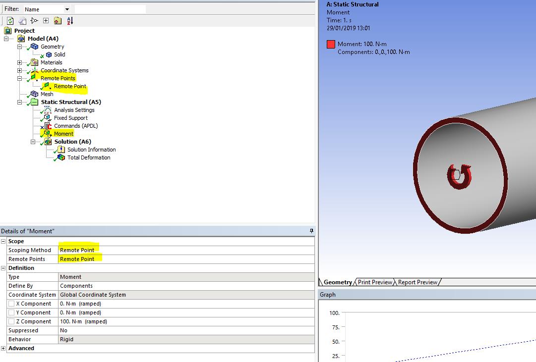 To apply a moment (100 Nm) to a remote point called remotepone (under details, definition, and APDL name) you need to probably insert something like this as a command snippet (F command):