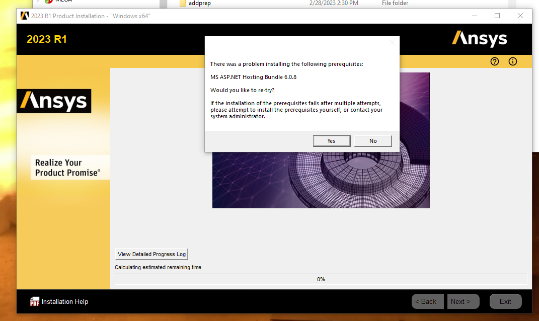Oh, there was one thing. When I upgraded to 2023 R1 earlier this week, a couple days before I starting seeing this error I got this install error. It let me skip it and I wasn't having any issues using explicit dynamics with the install for a couple days. Once the error started I thought maybe this was related so I manually installed the .NET package. One subsequent re-installations of ANSYS at least I didn't get this particular problem, but the Fortran error has persisted.