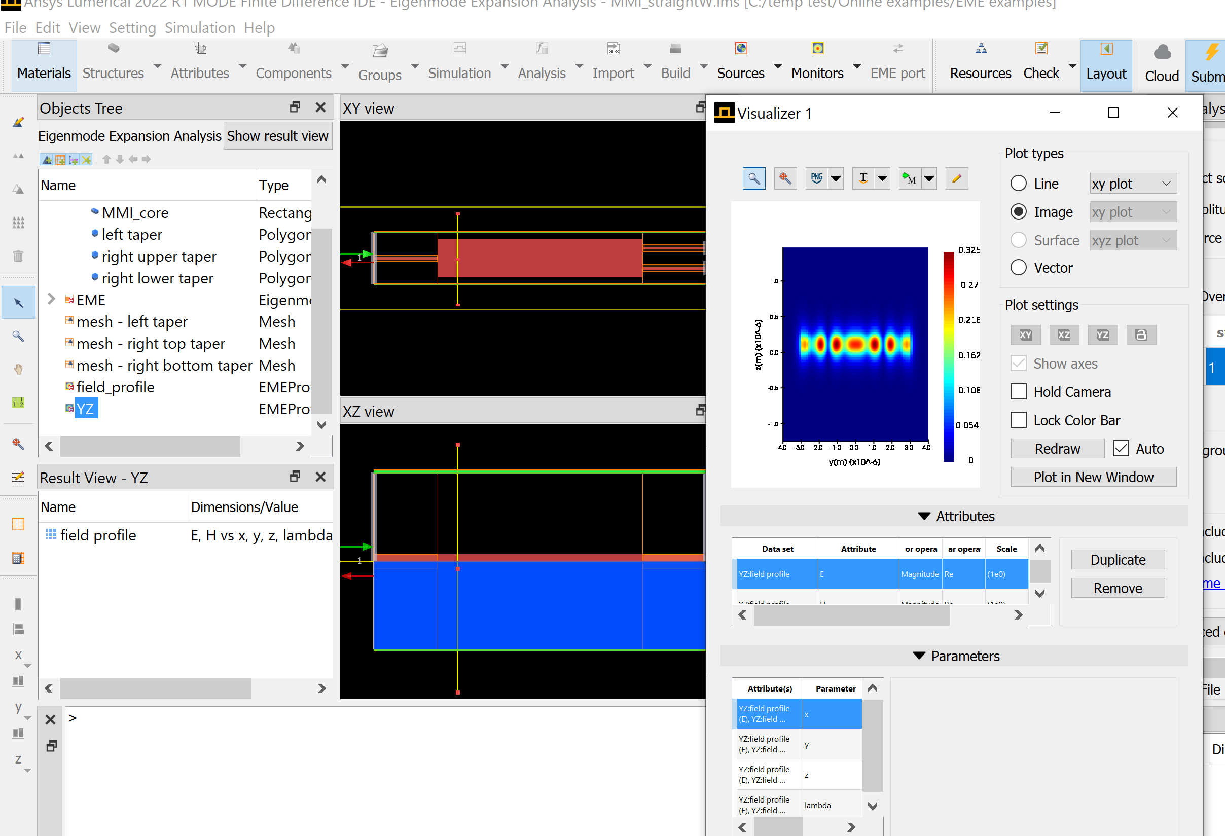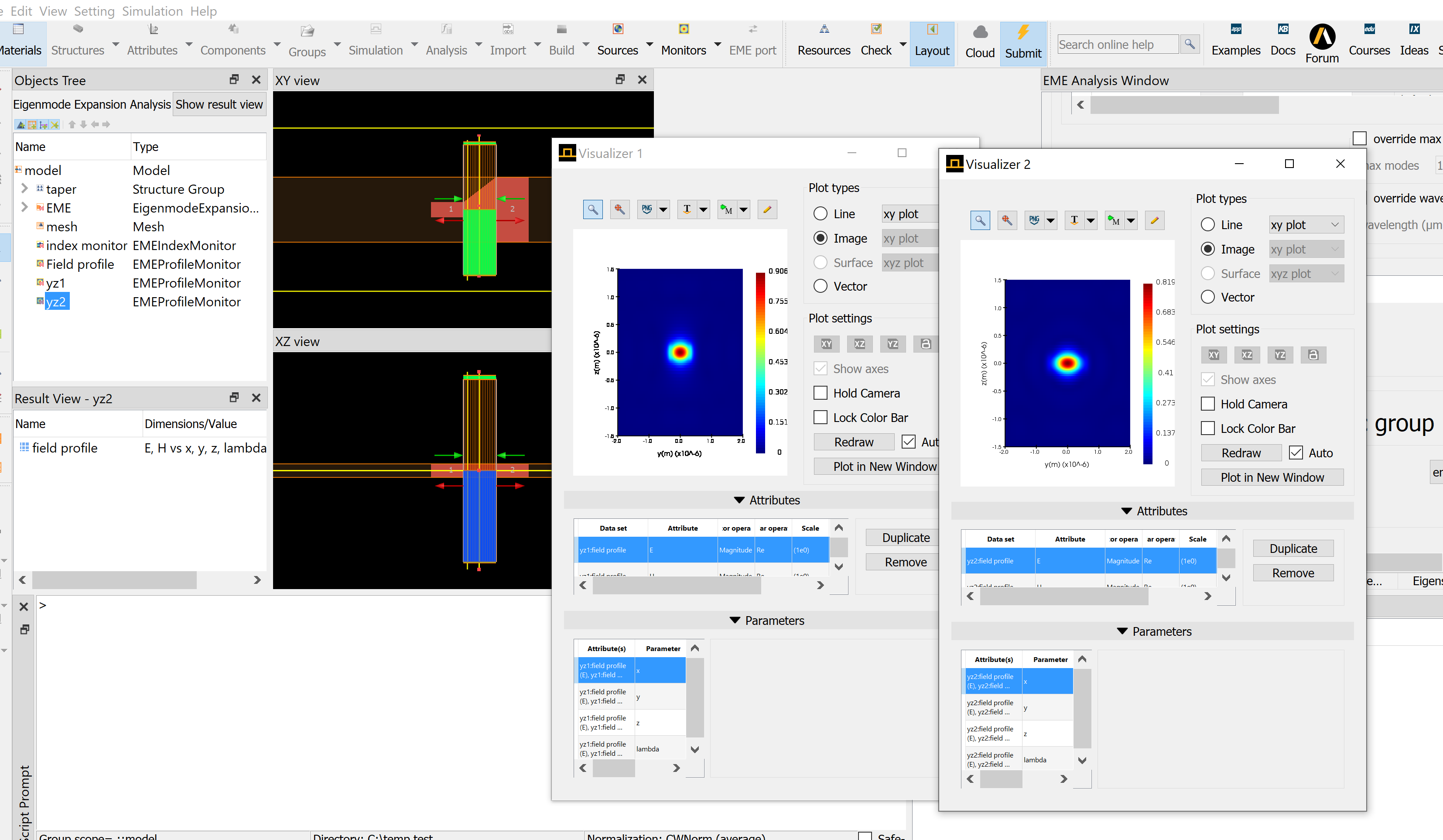 SubscriberThanks for your reply! Please note that I am using the Linear taper example (https://support.lumerical.com/hc/en-us/articles/360042800413-Linear-waveguide-taper), not the MMI example in your post above. I did indeed run eme propagate. But the YZ monitor I put at x = -0.5 (middle of left narrow waveguide region) did not update with any results.