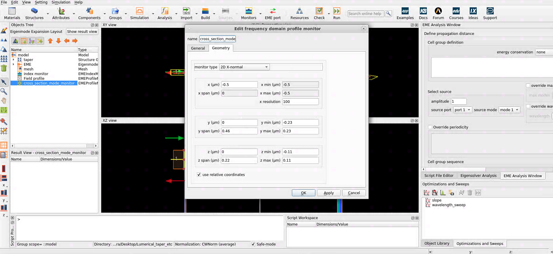 However, I noticed that when I move my YZ monitor to the right of x = 0 (for example to x = +0.5) and re-ran eme propagate, the monitor updated with results and I could visualize the mode. I do not understand why the monitor failed to update with results when it was to the left of x = 0, but updated with results when placed to the right of x=0. The location of the monitor along the waveguide taper should not matter, correct?