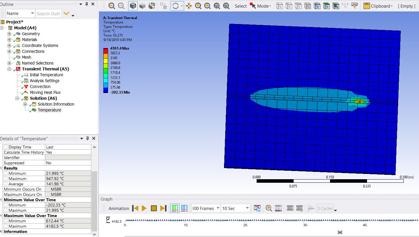 I tried to simulate the butt welding to the plates shown in the picture but after I apply heat flux, the plates cool down rapidly, I have assigned structural steel as the material to the plates with convection of 7 Watt per meter square degree celsius. Also, it shows the negative temperature value in the beginning and temperature does not get distributed over the plate surface. My model has a length of 0.35m.
