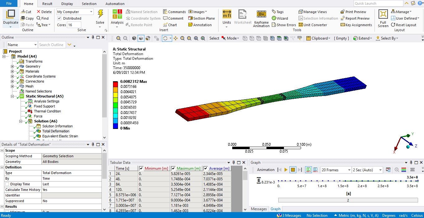 In reality the sample is loaded at one end and compressed, upon switching to the compression support the material no longer fails but the deformation of the material is not distributed in the way I would expect and despite the simulation running I am getting a pivot warning and warning that there are not enough constraints. Originally I had the load applied as a force to a single face but even using a pressure on the same face the distribution of deformation is not uniform. This doesn't happen when I use the fixed support, in this case the deformation is evenly spread along the face.