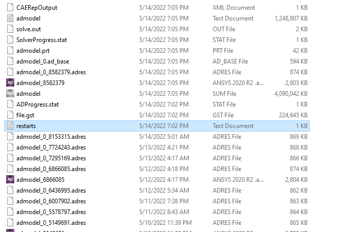 I was working on explicit dynamics, the calculations were running ond 14 May at 1630 with 99.5% completion and job remaining time was shown as to be close to 1 to 2 hour. When I came back after one day I found the PC Shutdown. I am not able to recover the same. When I checked up the dp0 folder, I found one Autodyne file saved for 14 May at 1902 hrs and one ".gst" file which is 224 MB and ".sum" file of 4GB also saved at 1902 H on 14 May. Can I retrieve my lost file from this???