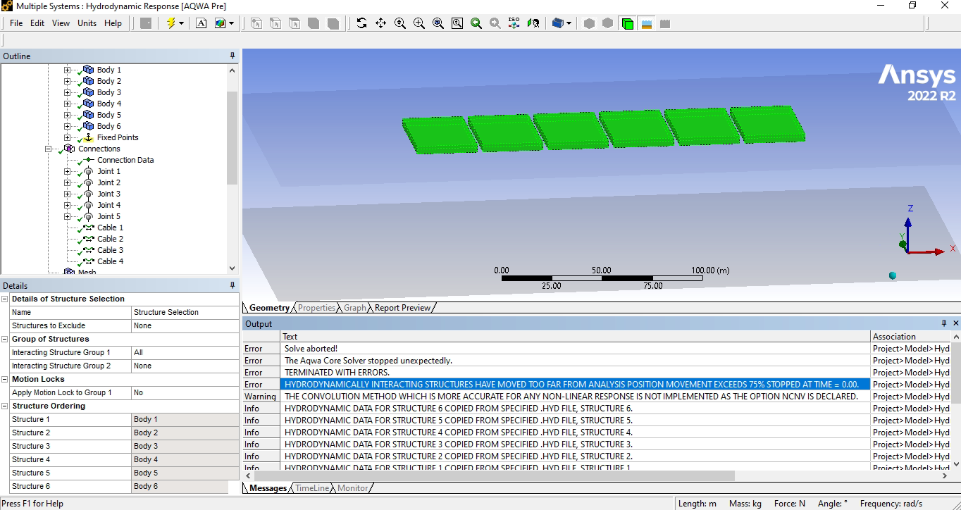 I changed the order of the structure (body 1 - ... - body 6) and it is the same arrangement in Hydrodynamic Diffraction analysis (see picture below). I did run the Hydrodynamic Response and again the same error occurred!