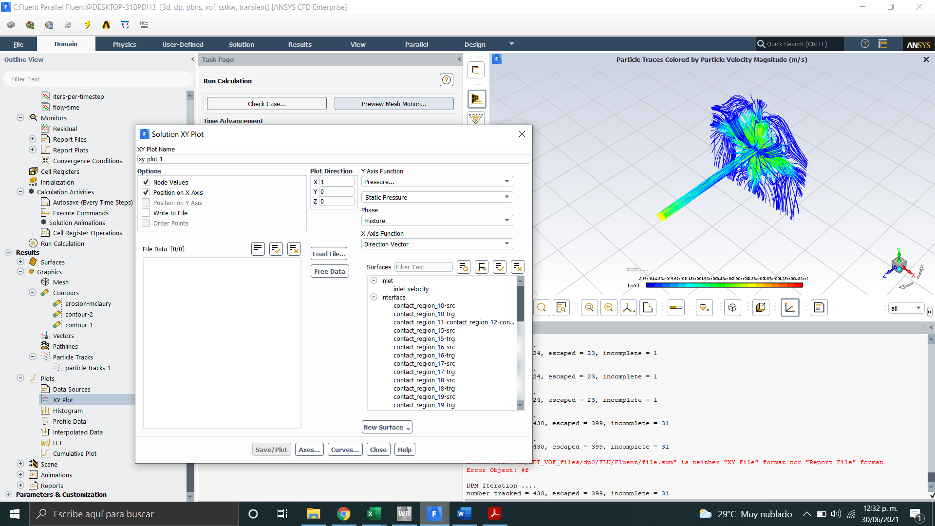 SubscriberHallo i appreciate your contributuion, bassically i want to make some plots for example "Particle angle of impact (also how can i get this value) vs radial distance (at wall) i understand that the DPM variables are in a Langrangian frame, so how is possible to do that, in Fluent, with X-Y plots only the variables for the domain (eulerian frame) are available