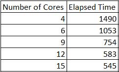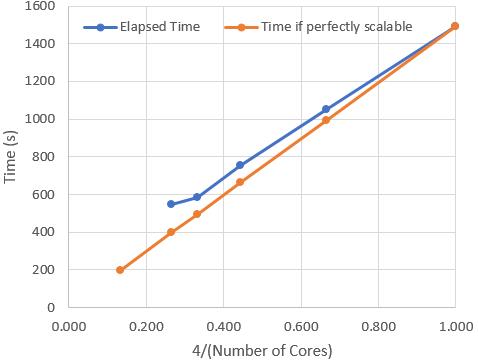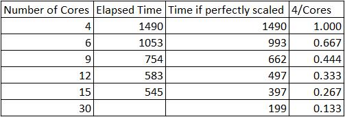 It would be great if the elapsed time was cut in half when the number of cores doubled. That almost happens when you go from 1 core to 2 and from 2 cores to 4, but it starts to go off that trend when the cores increase to 8, 16, 32, etc.