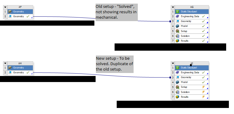 Note: Workbench shows the solution cells for the older set ups as "up-to-date", which usually means the results should be available and could be read/seen.