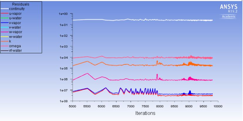 Please see the attached image and would you give me any idea why I am not getting any residuals for liquid phase? Why the model is not showing data for wall film?(I know know it's not converging but that is not my concern now ,I can change other setting but I want to see the residuals for water)