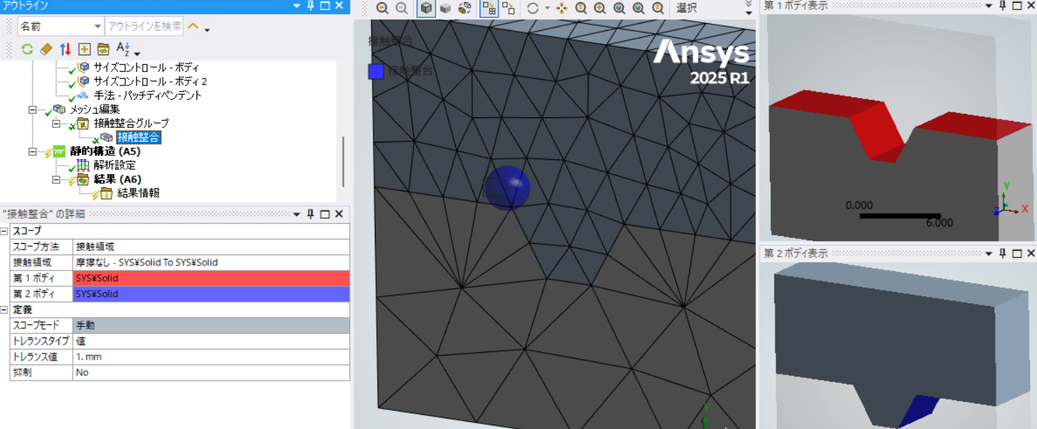 Ansys Employee該当ボディのメッシュが手法:四面体のアルゴリズム:パッチディペンデントで作成されている場合、メッシュ編集 > 接触整合機能で整合できる可能性があります。