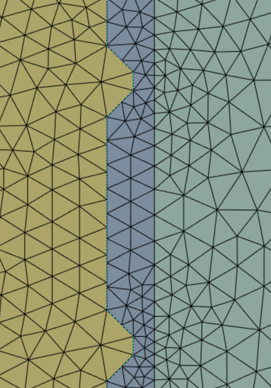 添付画像のように異なるジオメトリ(材料)間でのメッシュの整合が取れません。また、界面には「摩擦なし」を定義したいがためにこれらを同一のパーツとして扱うこともできません。メッシュの詳細から「アダプティブサイズを使用」を「Yes」とするとメッシュはつながりますが、「No」とするとつながらなくなります。応力集中を考慮して局所的に細かいメッシュを作成したいため、「No」のままメッシュをつなげられる方法はありますでしょうか。