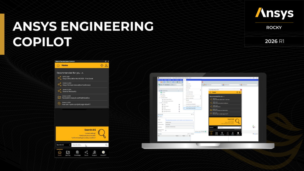 Ansys Rocky 2026 R1 has Ansys Engineering Copilot, an AI-powered assistant designed to help users quickly find technical information and learn from the broader Ansys knowledge ecosystem.