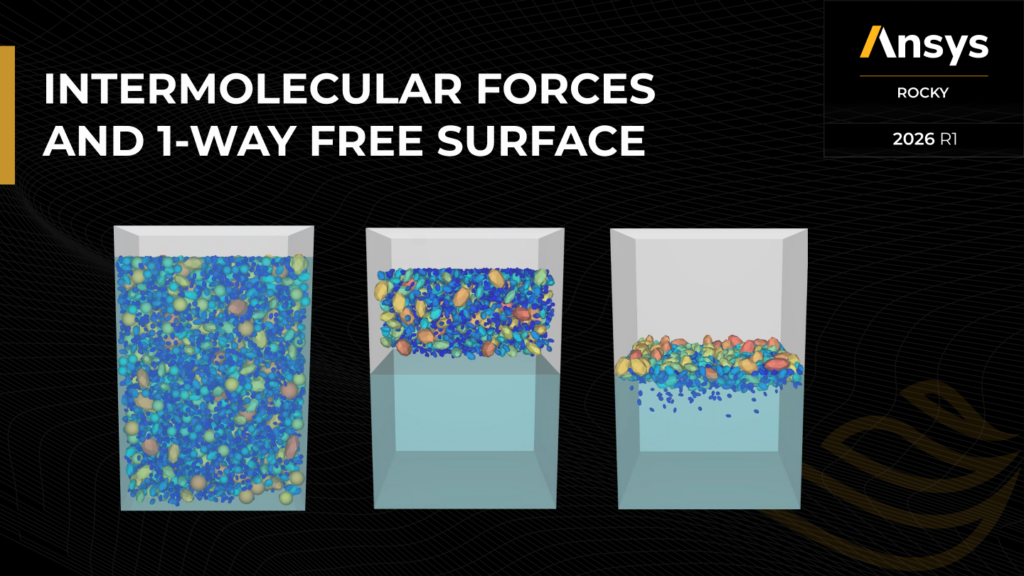 Ansys Rocky 2026 R1 introduces the Intermolecular Forces and 1-Way Free Surface modules to support simulations in which particle behavior is influenced by surrounding fluids without explicitly modeling the fluid phase.