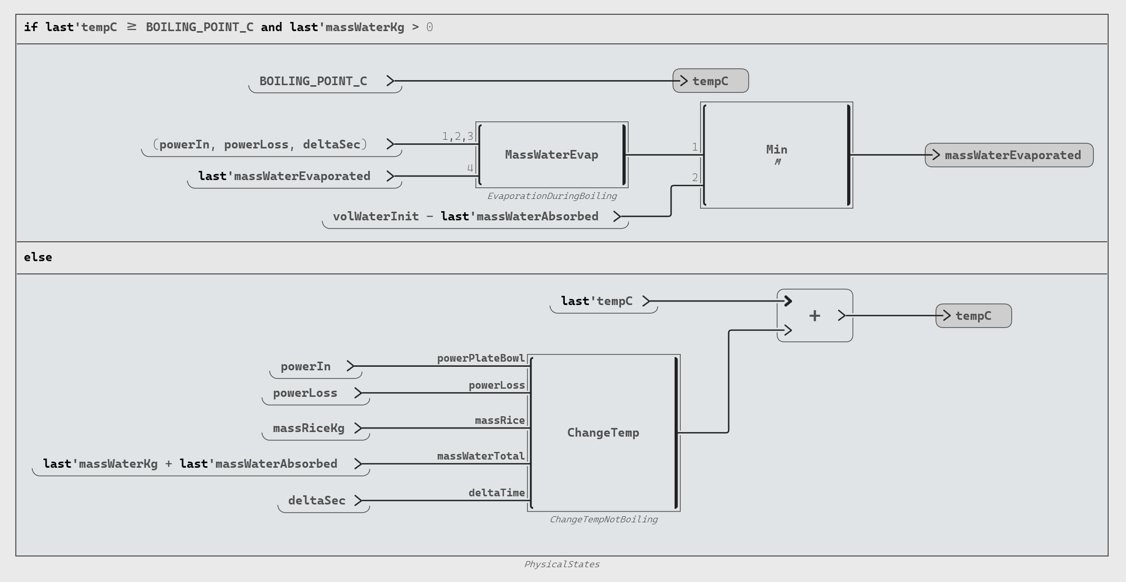Figure 6: The plant model distinguishes boiling and non-boiling behavior💡 TIP: Computation of the different physical characteristics (mass, volume, power, etc.) can be made clearer by using dedicated operator or being grouped with diagrams (used as named zones).