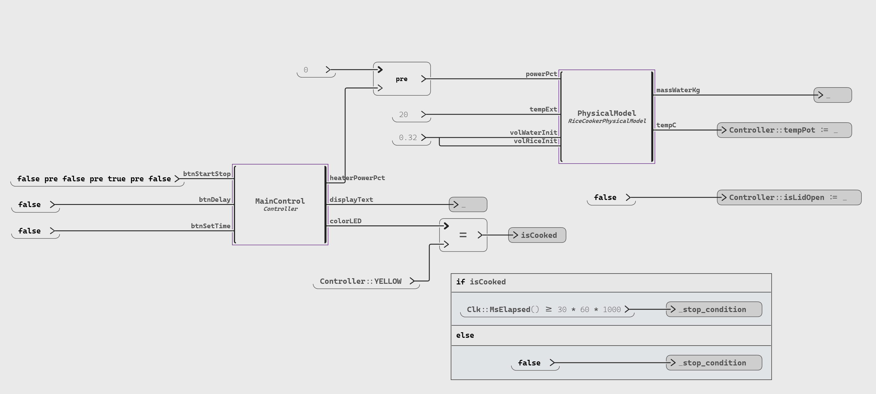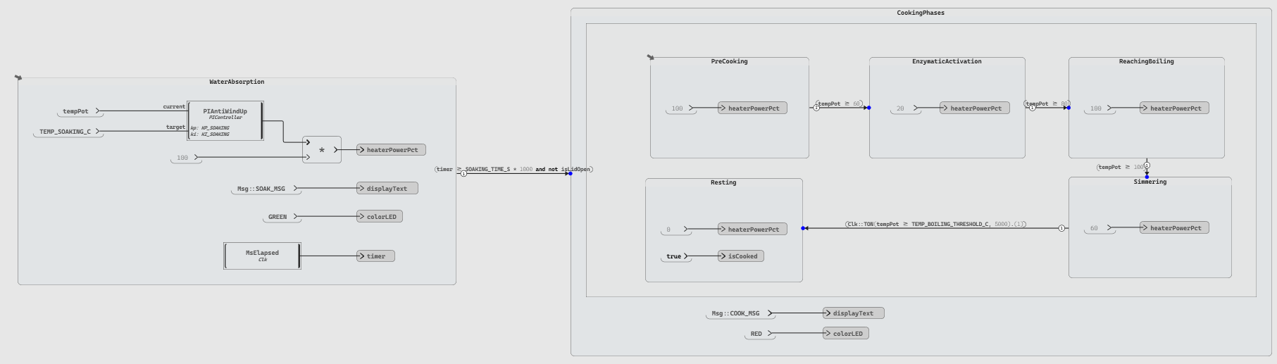 💡 TIP: The temperature of the pot and the lid sensor shall be connected to “Set Sensor” blocks (a Scade One test harness mechanism that injects values into sensor inputs).