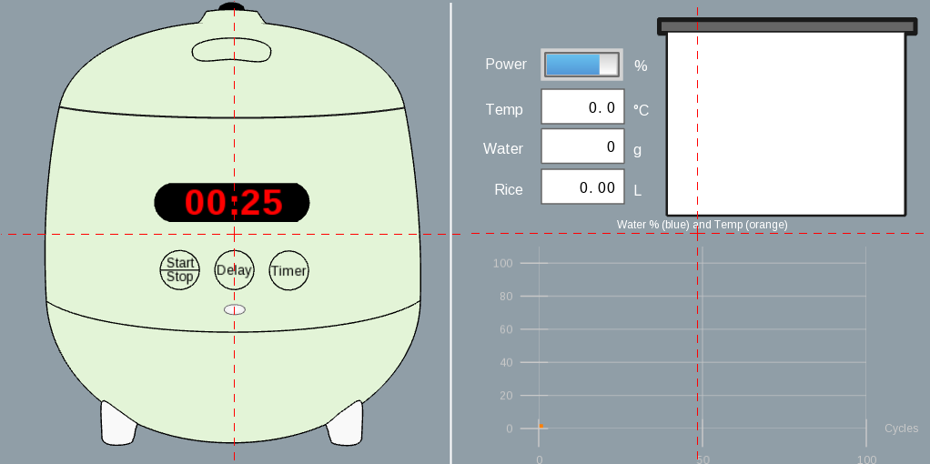 - a monitoring panel showing values such as temperature, power, water level, and rice volume