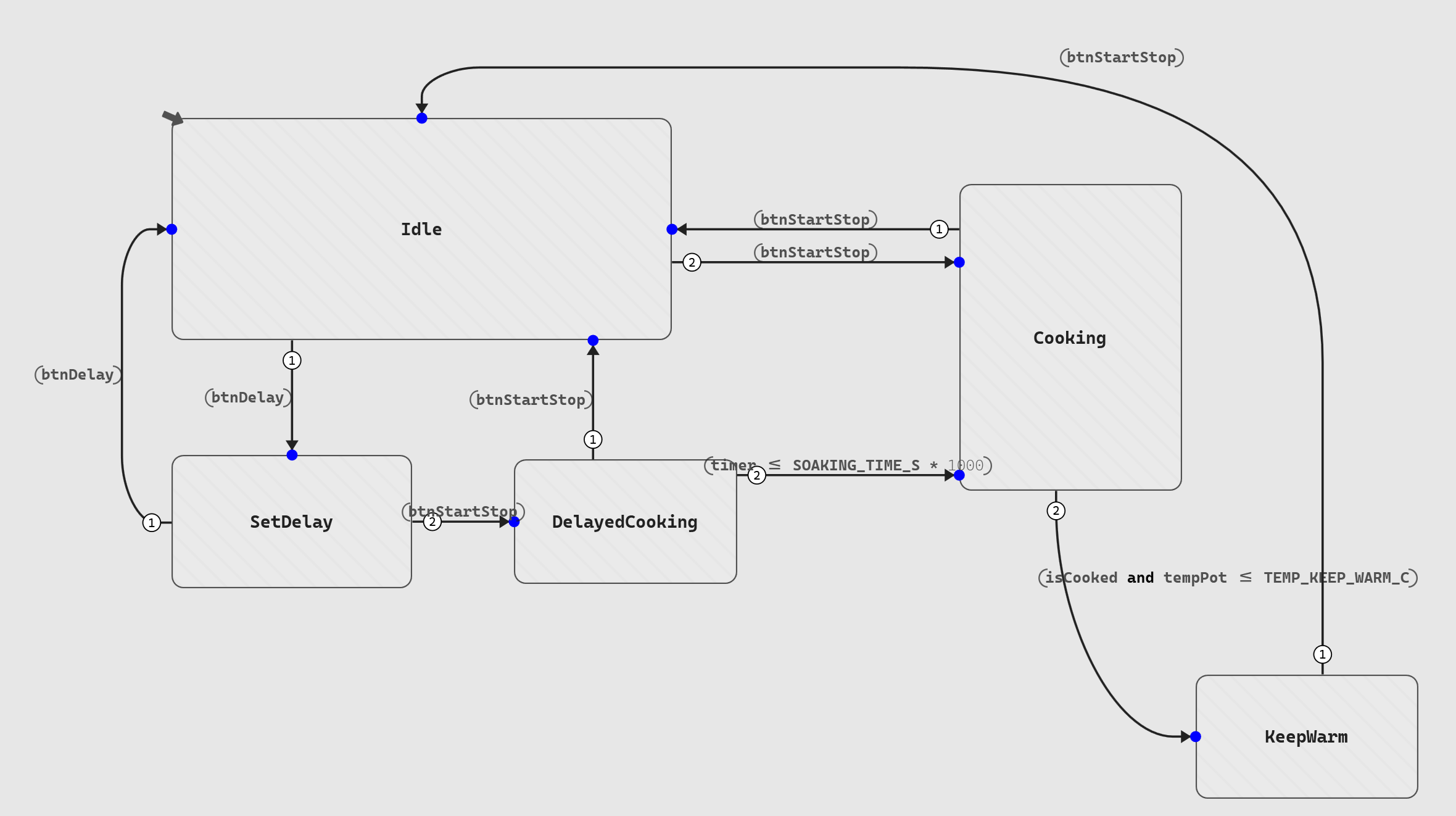 WaterAbsorption, which keeps the temperature at 45°C for a configured soaking timeKeepWarm(the next top-level state), which regulates the pot around 65°C to avoid bacteria multiplication (under 60°C) or drying out (above 80°C)
