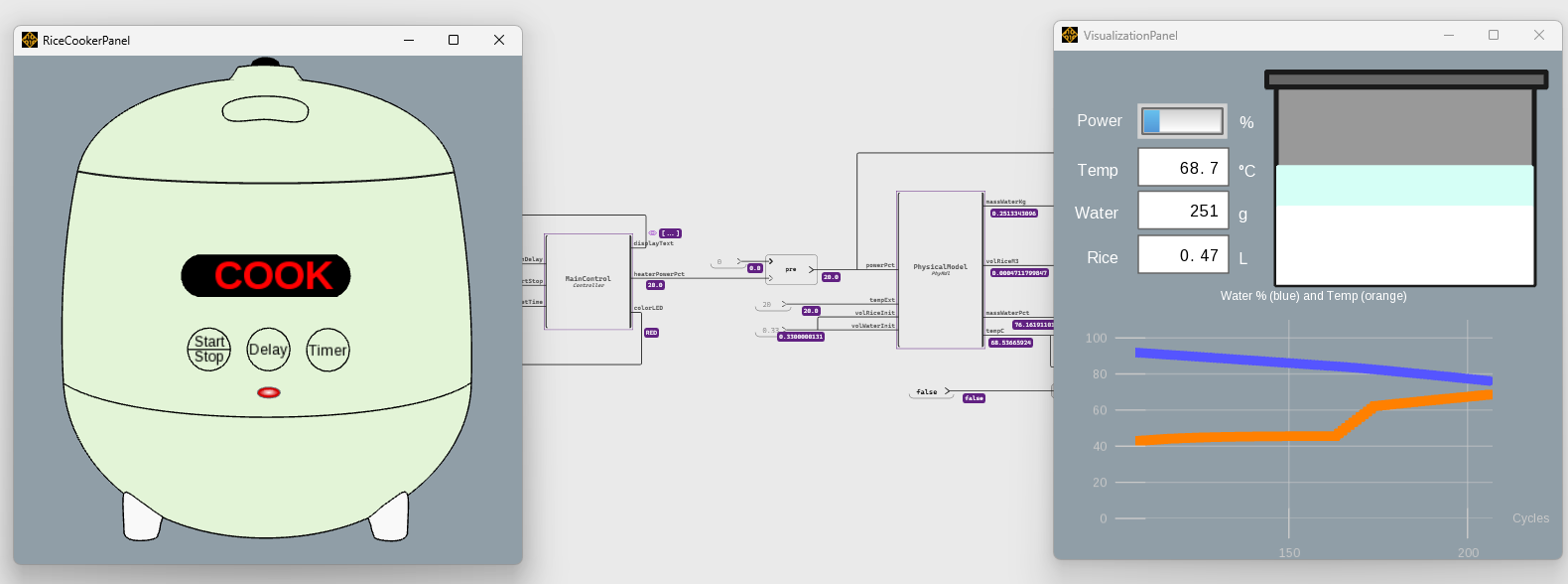 Figure 9: Two graphical panels for user interaction and signal monitoringThese two panels are more than a visual bonus: they allow us to interact in the way a user would. We can select a delay, press Start/Stop, watch the cooker moving through the phases, and even interrupt at any time we want. The second panel also shows us the engineering view to understand the physical behavior.