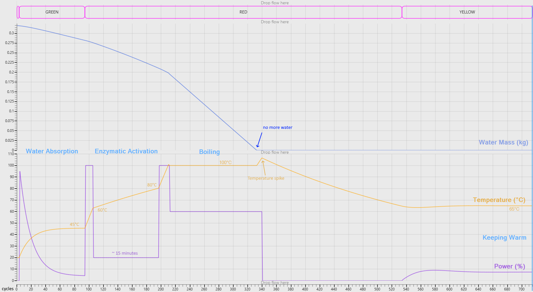 Cookingmode is the most interesting part of the model. It is itself split into several phases that match different steps for improving the taste of the cooked rice:WaterAbsorption: keeping the rice warm for some time to hydrate each grain of rice, resulting in fluffy and tender ricePreCooking: heating up to reach the next phaseEnzymaticActivation: slowing cooking between 60°C and 80°C to enhance nutrition, texture, and flavor by activating dormant enzymesReachingBoiling: reaching 100°C as fast as possibleSimmering: slow boiling until all water has evaporatedResting: letting the steam finish cooking the rice slowly and evaporating remaining moisture