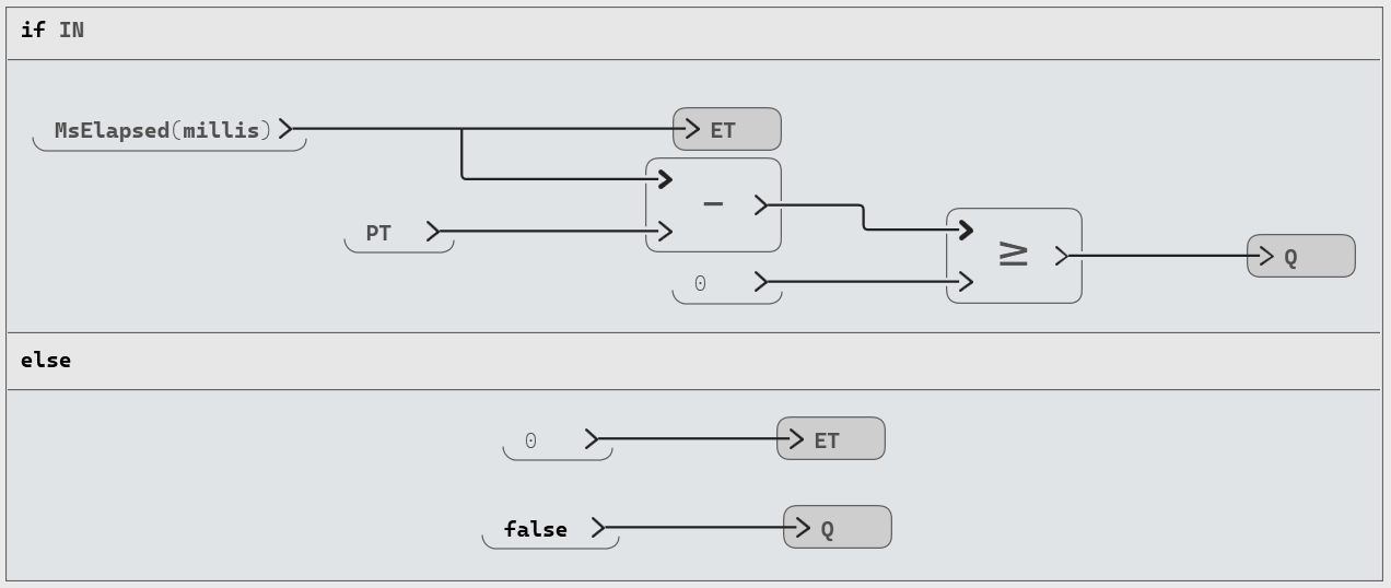 Figure 4: TON Operator whereQbecomes true ifINstays true forPTmilliseconds🏭 A simple plant model to test the logic