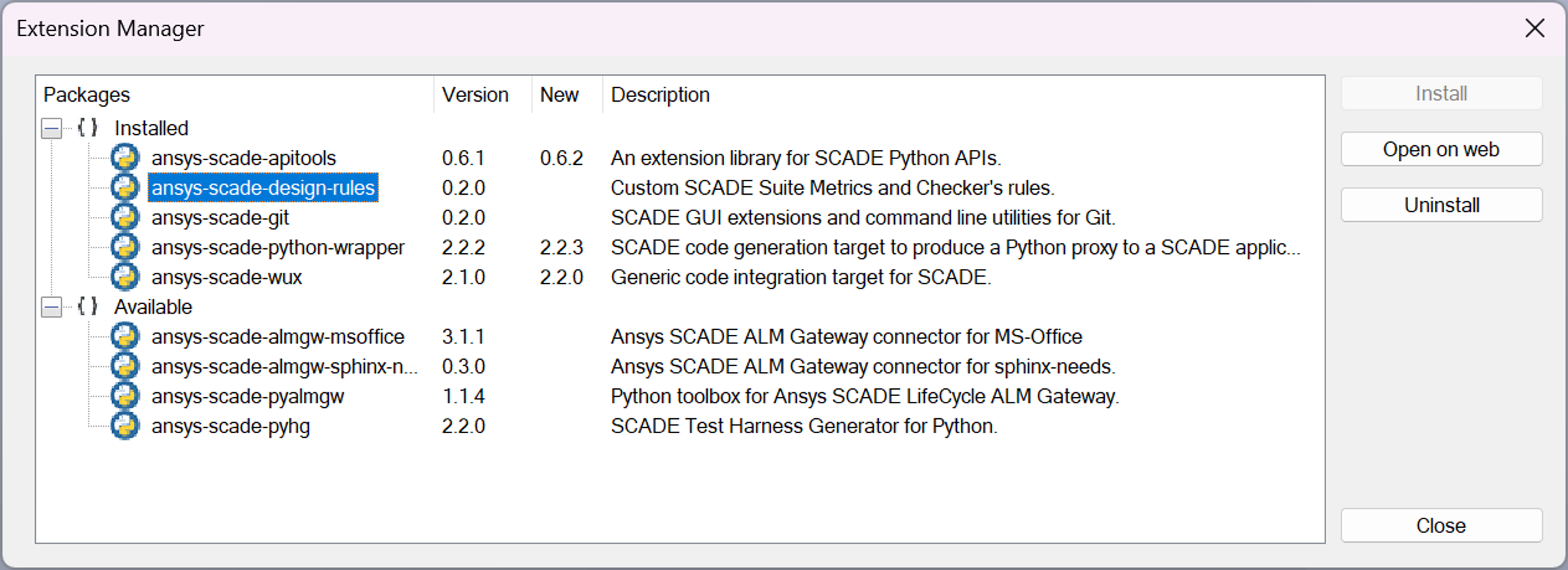 SCADE Suite extension manager with ansys-scade-design-rules installed