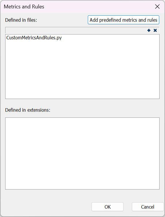 • If your metrics & rules apply to a set of models living in the same repository, you may want to store the script in the parent folder of your models, and reference it locally. In the screenshot above, it would be ../CustomMetricsAndRules.py.