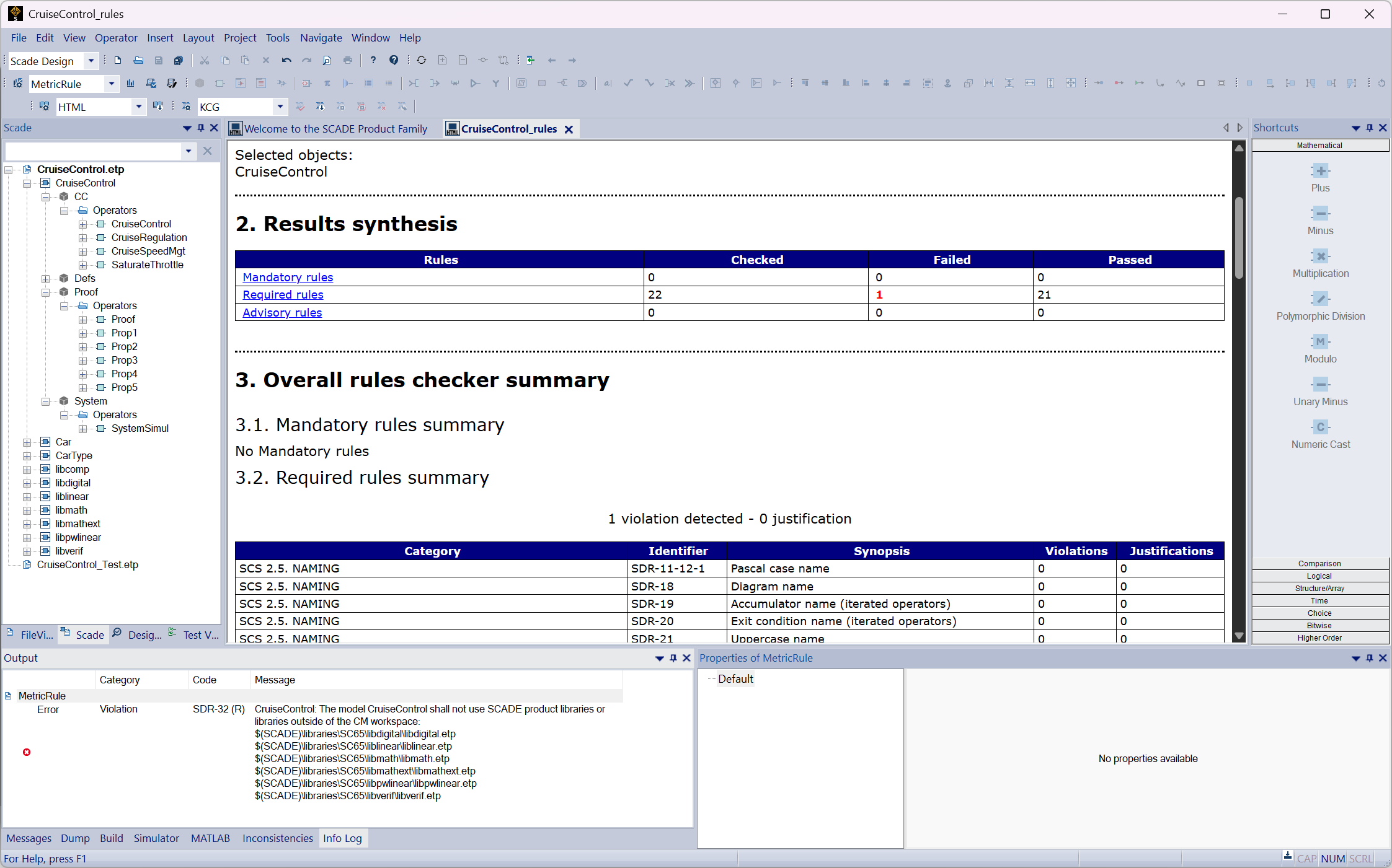 SCADE IDE overview after running a rule check. The central report and bottom left output window show that a required rule is violated.