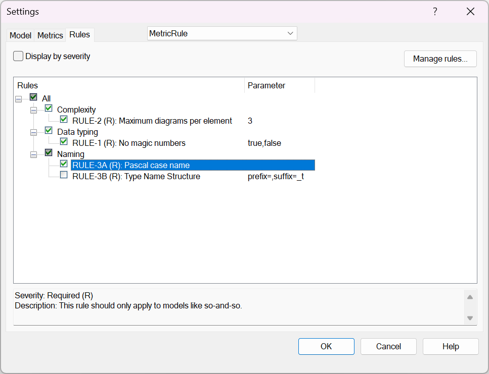 • The Metrics and Rules tabs allow you to selectively enable metrics or rules for the current model. In the image above, we have ticked RULE-3A Pascal Case Name for this model, and unticked RULE-3B Type name structure.