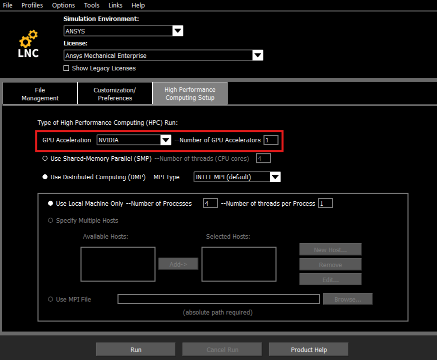 - In the Mechanical APDL Product Launcher, select the High-Performance Computing Setup tab, choose the appropriate GPU Acceleration option from the dropdown, and specify the number of GPUs to use during the solution.