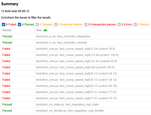 reset()to ensure a clean initial state. From there, set any required inputs to establish the desired starting conditions. Then, apply test-specific inputs and invoke the operator’s logic by callingcycle()as many times as needed. At any point, aftercycle(), you can validate behavior by asserting output values withassert:def test_controller_integration(check_cc_proxy): # TC_CC_I_002 assert check_cc_proxy # check_csm_proxy adds the cc module directory to sys.path from cc import Controller root = Controller() root.reset() # set the initial values for the commands root.on = False root.off = False root.resume_ = False root.set = False root.speed = 0.0 root.accel = 0.0 root.brake = 0.0 root.quickAccel= False root.quickDecel= False # Test Reference: CC_TEST_INT_01 # # Test Case Objectives: # verify the CC is started in STDBY mode when activated # while the driver accelerates. # # Test Case Acceptance Criteria: # cruiseState is STDBY, throttleCmd = accel, # and cruiseSpeed = speed root.speed = 100.0 root.accel = 25.0 root.on = True root.cycle() assert root.cruiseState == CC_STATE.STDBY.value assert abs(root.throttleCmd - root.accel) < 5.0e-6 assert abs(root.cruiseSpeed - root.speed) < 5.0e-6