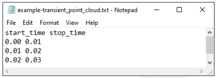 Transient Point Clouds consist of sets of Static Point Clouds that are applied during the simulation following specific start and end times. In order to import a Transient Point Cloud, it is necessary to import a main text, csv or xlsx file containing the start and end times of each Static Point Cloud that will be then automatically imported to compose the Transient Point Cloud. If desired, an optional third column with the name of the files (with the file extension) for each start and stop time, as shown below: